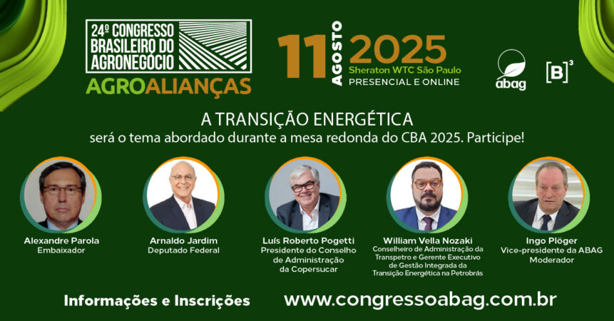 Os especialistas convidados para o 24º Congresso Brasileiro do Agronegócio (CBA) mostrarão como o agronegócio brasileiro está preparado para apoiar a transição energética, ao aplicar ciência e tecnologia para produção verde e eficiente. O evento, que acontece no próximo dia 11 de agosto, em formato híbrido, é uma realização da Associação Brasileira do Agronegócio (ABAG), em parceria com a B3, a bolsa do Brasil. As inscrições podem ser feitas no site oficial.