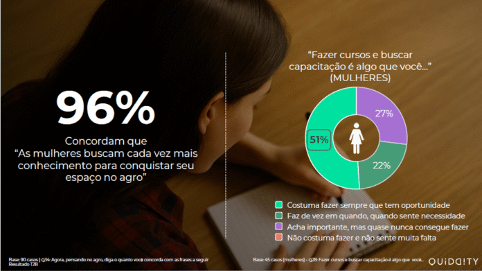 Nesse sentido, a busca por conhecimento tem se tornado peça fundamental para que suas ideias ganhem força e, em pouco tempo, tragam resultados surpreendentes no dia a dia do campo. Por isso, mais da metade das mulheres entrevistadas afirmam buscar capacitação de forma constante (51%) ou quando sentem necessidade (22%) por meio de cursos, palestras e eventos, não só para se manterem atualizadas e ganhar mais preparo, mas também para obter novas ideias e conseguir levá-las adiante na propriedade, mobilizando os que estão no seu entorno.